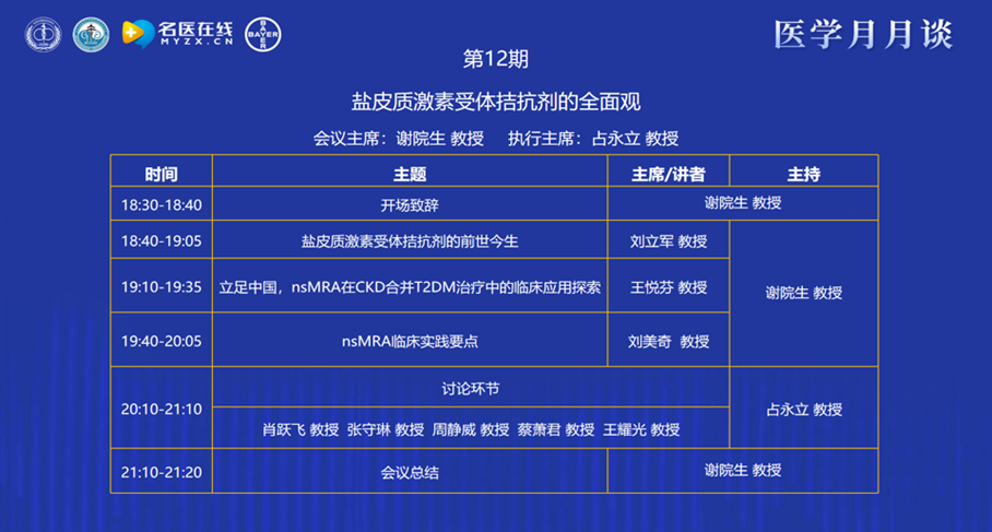 本期“医学月月谈”以“盐皮质激素受体拮抗剂的全面观”为主题,聚焦新型非甾体盐皮质激素受体拮抗剂在慢性肾脏病及相关疾病诊疗领域应用的热点话题。活动特别荣幸邀请到占永立教授担任执行主席,在占永立教授的统筹带领下,现场专家同道积极交流研讨、碰撞思想火花,围绕盐皮质激素受体拮抗剂的临床应用与探索展开深入探讨,为解决慢性肾脏病临床难题、提升诊疗水平贡献了宝贵智慧与力量。
