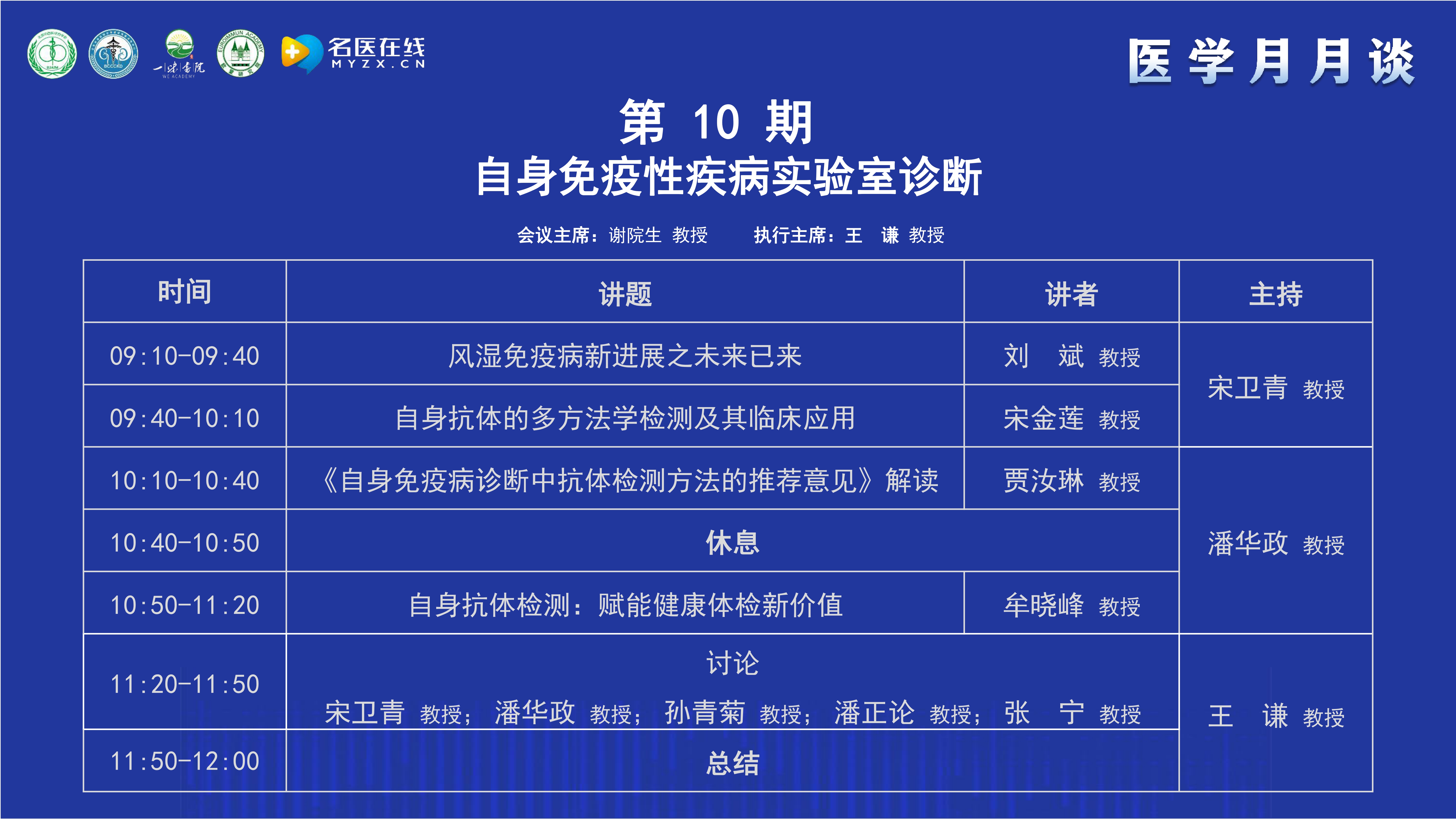谢教授简单介绍了“医学月月谈”的前身“肾病月月坛”的历史,“肾病月月坛”是在疫情防控期间开展的线上学术交流活动,以肾脏病或系统性疾病肾损害的诊治为主,每期一个主题,形式和内容都很受欢迎。为了让更多的人受益,升级为“医学月月谈”。“医学月月谈”秉承“肾病月月坛”的优良传统,聚焦医学工作的热点和难点,以临床需求为导向,以解决临床问题为目的,每月主办1-2次线下和线上相结合的医学交流活动,线下在全国的城市轮流举办,已相继在北京、沈阳、上海、南京、武汉、福州、新疆等地成功举办9期医学月月谈。本期医学月月谈的主题是自身免疫性疾病实验室诊断,非常荣幸的邀请到山东大学齐鲁医院王谦教授作为本期的执行主席,相信本期月月谈将在王教授的引导下,在各位专家们的大力支持下,取得圆满成功。